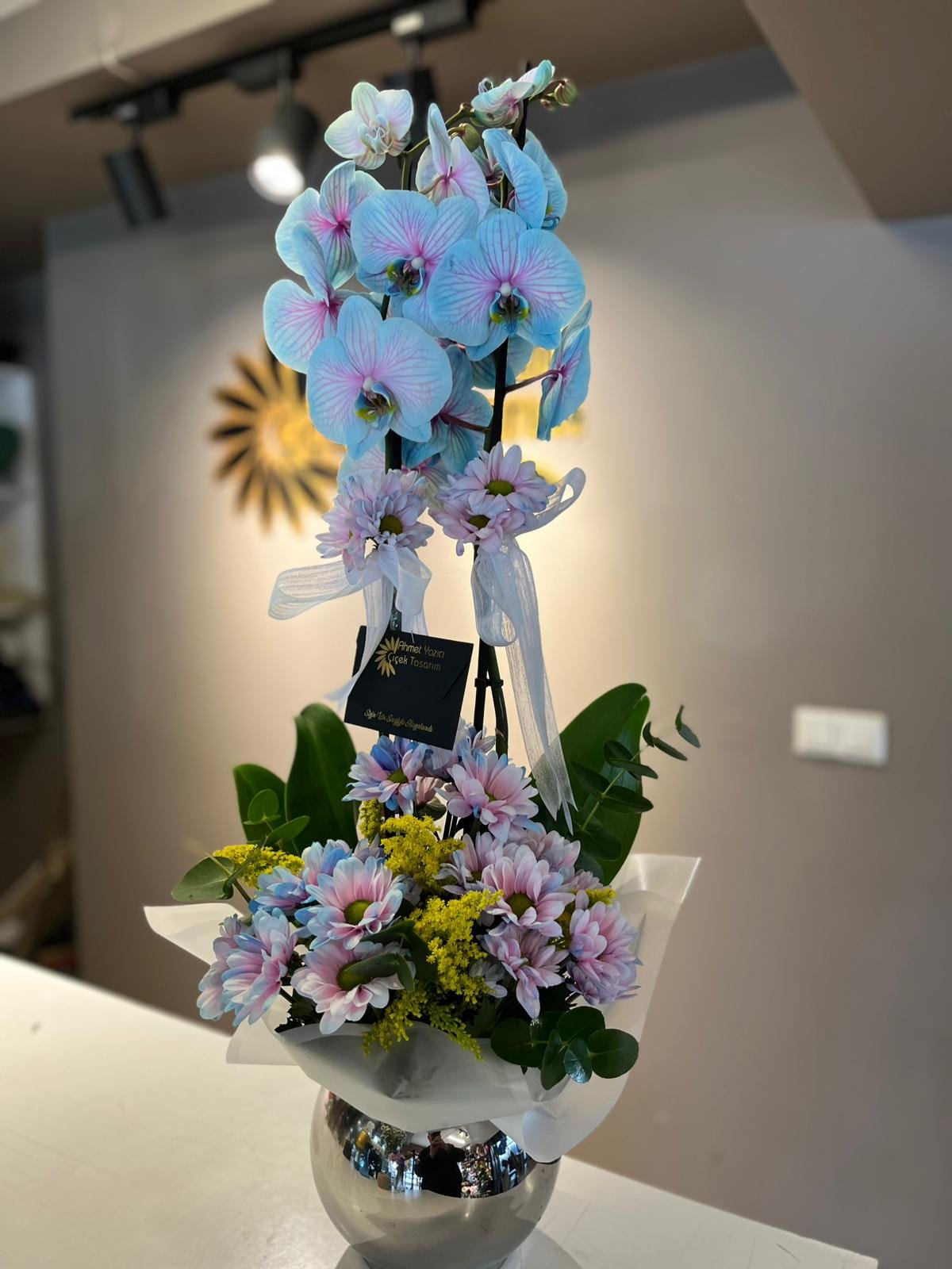 Mavi orkide süslemeli şık vazo içerisinde tasarlanan bu eşsiz aranjman, doğanın zarafetini modern bir dokunuşla buluşturuyor. Canlı mavi orkidelerin büyüleyici tonları, zarif vazo tasarımıyla bir araya gelerek göz alıcı bir uyum oluşturur.