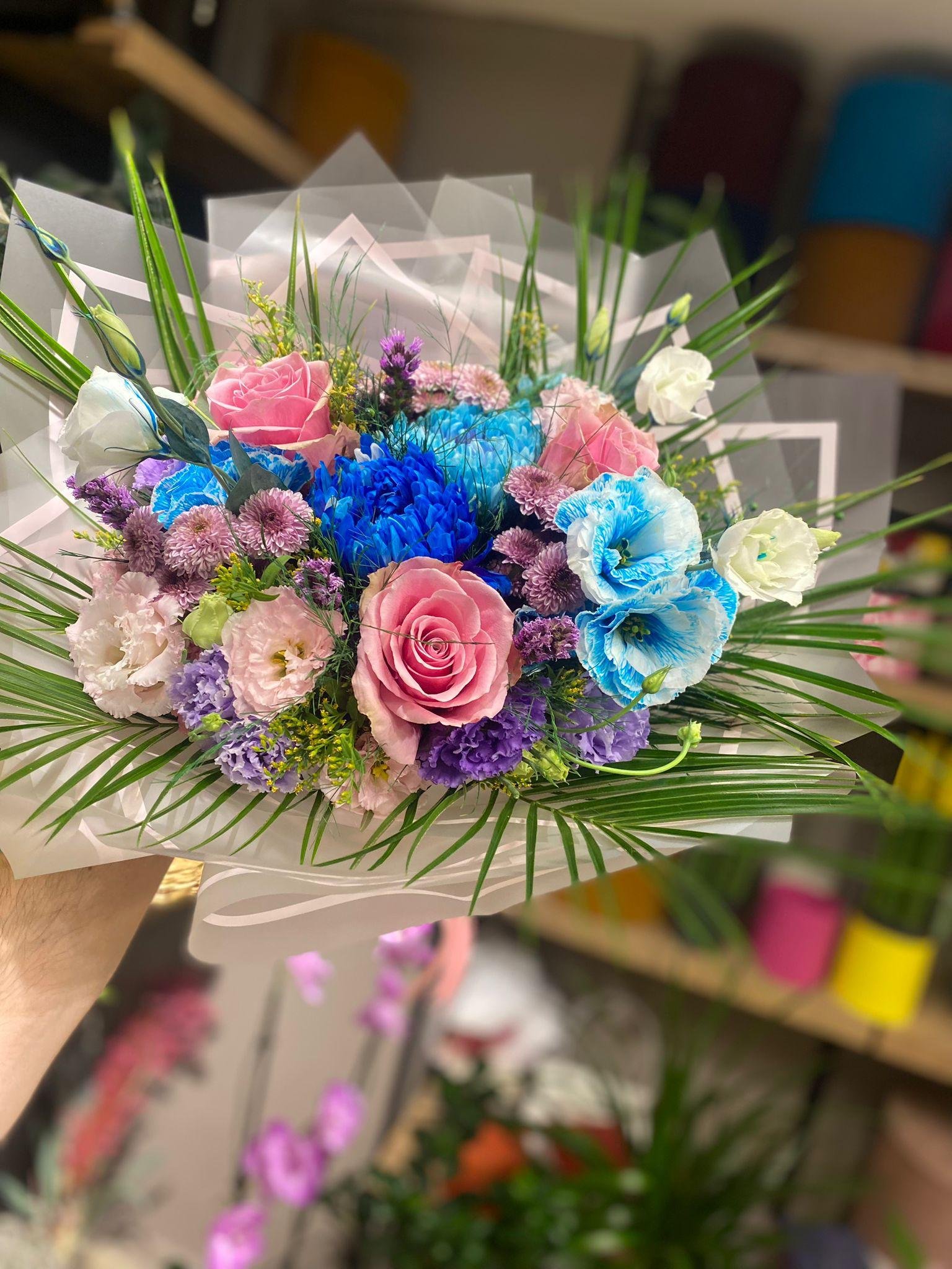 Zarafetin ve lüksün buluştuğu bu özel buket, pembe güllerin romantizmini, beyaz güllerin saflığını ve mavi çiçeklerin huzur veren enerjisini bir araya getiriyor. Ortasında yer alan mavi tonlu nadir krizantem, tasarımın göz alıcı merkezi olurken; mavi karanfiller ise bukete sofistike bir derinlik katıyor. Tropikal yaprak dokunuşlarıyla tamamlanan bu premium tasarım, hem görsel hem de duygusal anlamda unutulmaz bir iz bırakmak için hazırlandı.