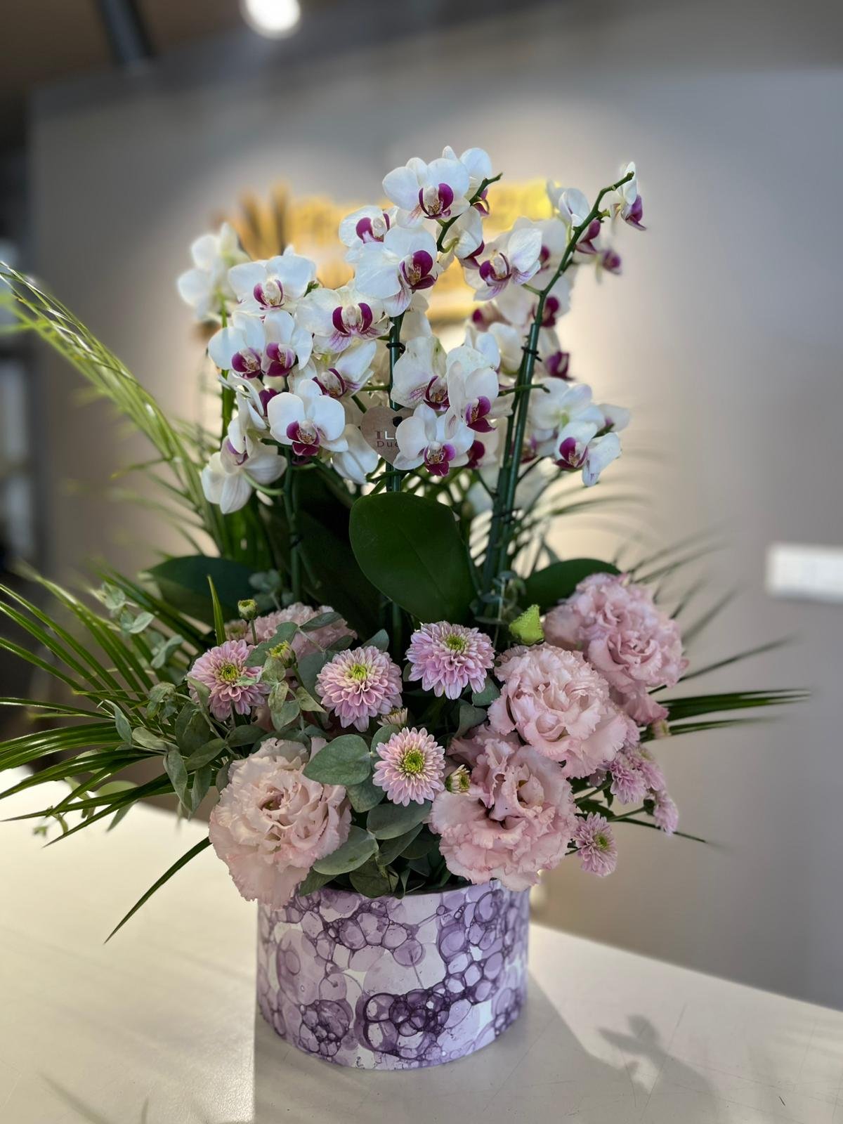 Beyaz ve mor orkide çiçeklerinin mükemmel uyumuyla tasarlanan bu arajman, hem klasik hem modern çizgileriyle dikkat çeker. Şık seramik saksısında özenle hazırlanan Düetto Orkide, doğum günlerinden yıldönümlerine, ofis açılışlarından teşekkür hediyelerine kadar her özel ana anlam katar.
