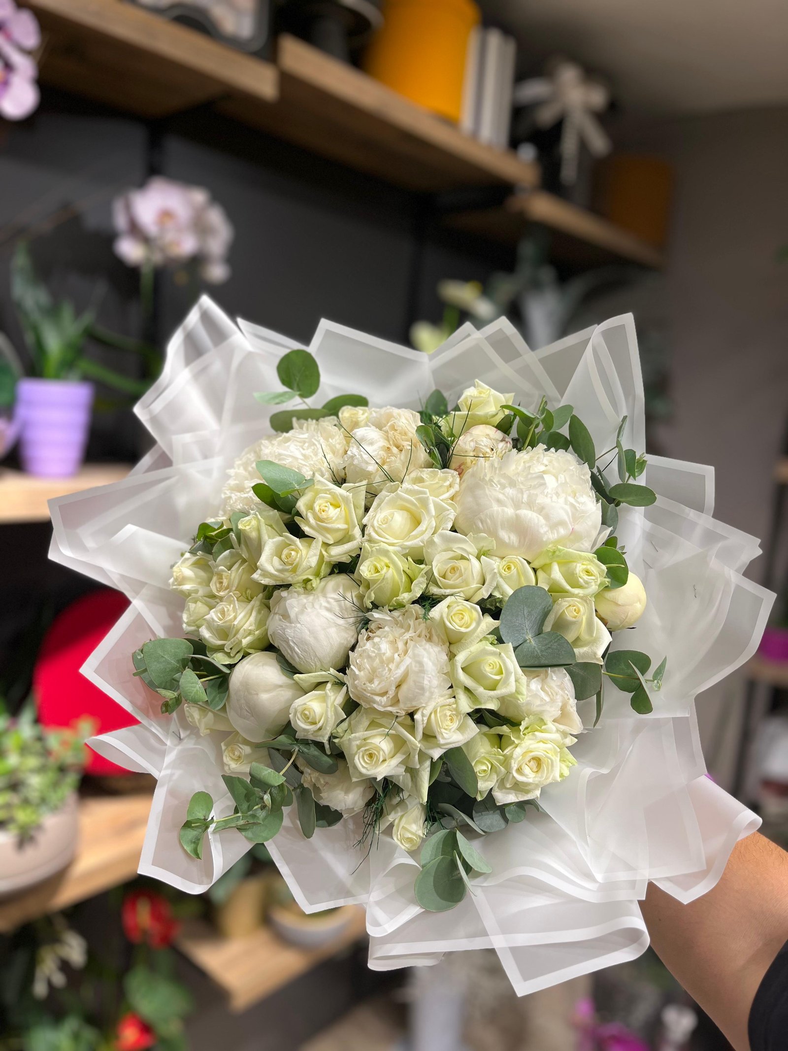 Her biri özenle seçilmiş taze şakayıklar, beyaz güllerin masum güzelliğiyle buluşarak göz alıcı bir uyum oluşturur. İster doğum günü, ister yıldönümü, ister sadece “Seni seviyorum” demek için olsun — bu özel buket her anlamda duygularınızı ifade etmenin en şık yoludur.